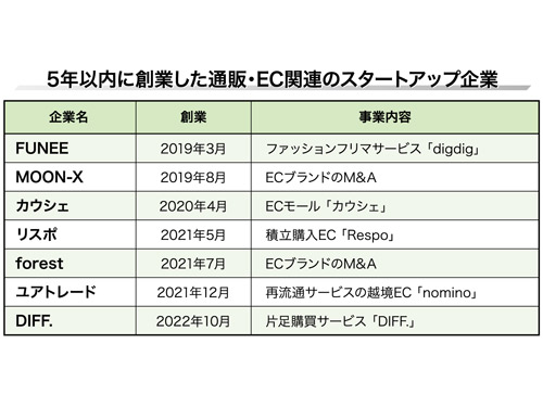 2024年は早々から、新しいサービスを開始する通販・EC関連のスタートアップ企業が目立つ。スタートアップ企業が目立っているのは、ベンチャーキャピタル(VC)の存在が大きい。従来よりもVCが増え、投資先や時期は多様化している。ECのスタートアップは「循環」「利便性」「M&A」などで事業形成したり、DXや課題解決を目的に事業を展開したりする企業もある。国内外で経済情勢が不透明な中で、スタートアップ企業の台頭に注目が集まる。