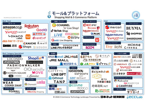コロナ禍を経て、EC市場におけるECモールのシェアは年々、高まっている。一方で大手ECモールの成長は鈍化傾向にあるが、依然として規模を拡大しており、中堅モールで2桁成長を遂げているところもある。さらにTemuなどグローバルなマーケットプレイスが日本市場での展開を強化している。EC市場全体の成長率が低下する中、EC事業者にとって、事業を拡大するために、「どこの売り場を選ぶか」は重要な経営判断だ。本特集では、有力モールの責任者に聞いた事業戦略を紹介するとともに、ECのネットメディア「Eコマースコンバージョンラボ(eccLab)」と共同で制作したカオスマップも掲載する。