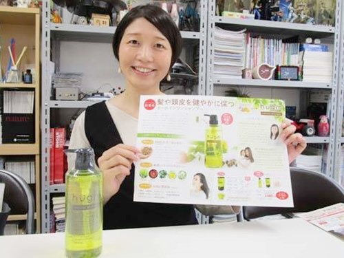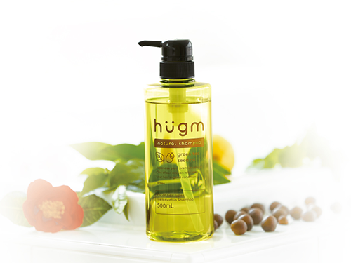 「hugm」はシャンプーとリンスの機能を兼ね備えたオールインワンシャンプー。茶ノ実油と五つの国産成分を配合し、子どもから大人まで安心して1本で洗髪を済ませることができるという。