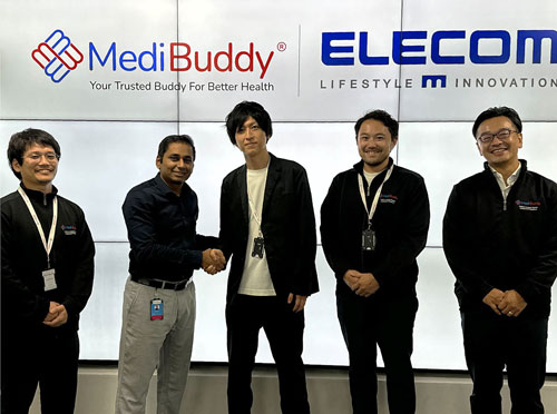 左から2番目:メディバディ 共同創設者兼最高経営責任者(CEO) サティシュ・カンナン氏、中央:エレコム ヘルスケア事業部 執行役員 部長 医師 葉田甲太氏