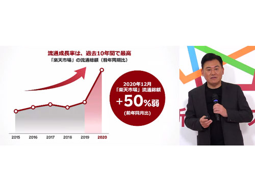 楽天は1月28日、「楽天市場」の出店店舗向けイベント「楽天新春カンファレンス2021」を開催し、三木谷浩史社長が講演を行った。「楽天市場」の20年の流通総額は3兆円を超えたと明言。30年ごろまでには10兆円を目指すという。三木谷社長は「アマゾンやヤフーよりもバンバン伸びていると思う」と強調し、コロナ禍における高い成長を印象付けた。