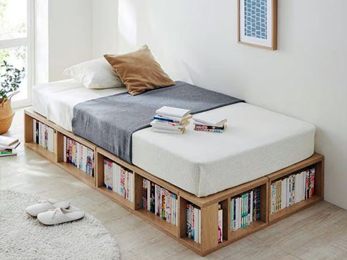 「ずらっと本が並ぶベッドになるマルチユニット」は税込1万3000円。四つそろえるとシングルベッドのサイズになる。