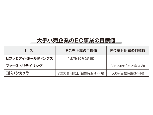 大手小売企業が相次いで、売上高に占めるECの比率を急拡大させる構想を明らかにした。ファーストリテイリングは数年以内に、EC事業の売上高比率を30%以上に高める方針を発表した。ヨドバシカメラは将来的にEC売上高を店舗売上高と同等の規模にまで拡大させたいという。セブン&アイ・ホールディングス(HD)も比率にこそ言及していないが、19年2月期にEC売上高を現在の5倍超に当たる1兆円にまで伸ばす計画を発表している。大手小売各社がEC売上高についての強気の目標値を相次いで公開する背景には、オムニチャネル(オムニ)に取り組む決意を社内外にアピールする狙いがあるようだ。