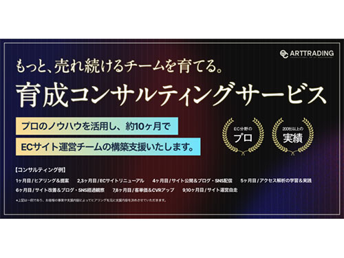 ECサイトの構築や運営代行を行うアートトレーディング(本社東京都、藤井玲社長、(電)03―5422―3348)は9月6日、ECサイトの運営者を育てる「育成コンサルティングサービス」の提供を開始した。