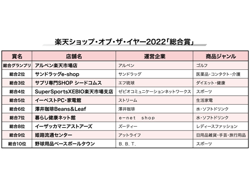 楽天グループは1月25日、ECモール「楽天市場」の年間ベストショップを表彰する「楽天ショップ・オブ・ザ・イヤー(SOY)2022」の表彰式を開催した。