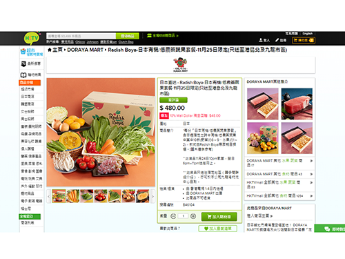 現地のECモールに出店することで初の越境ECに乗り出したのが、らでぃっしゅぼーや。10月に香港大手のECモール「HKTVモール」に出店し、野菜と果物のセット販売を始めた。16年2月期を初年度とする3カ年の中期経営計画の中で「海外展開の事業化」を盛り込んでおり、モールへの出店はその第1弾となる。「さまざまな方法を検討したが、モール出店はリスクが少ない」(マーケティング室・寺井真紀子氏)と判断した。