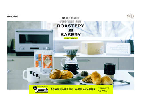 コーヒーのサブスクなどを展開するPOST COFFEE(ポストコーヒー、本社東京都、下村領CEO)は4月3日、自社ECサイト内に、冷凍パンのサブスク「パンスク」とのコラボページをオープンした。各サービスの紹介やクーポン配布などのキャンペーンを、5月31日まで実施する。