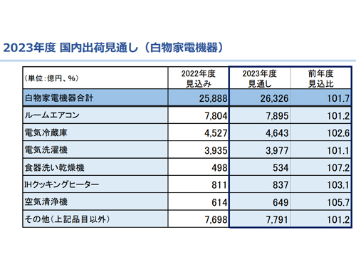 (一社)日本電機工業会(事務局東京都)が今年3月に発表した23年度の白物家電機器の国内出荷見通しによると、出荷額は前年比1.7%増の2兆6326億円だった。高付加価値製品の需要や製品単価の上昇が継続し、金額は前年度を上回る予測となった。また、外出機会の増加など消費行動のシフトが見込まれ、「買い替え需要」は堅調に推移するとした。