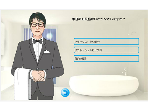 同社が運営するECサイト「お風呂のソムリエSHOP!」に配置したキャラクターの名称は「bathly(バスリー)」。「バスリー」は特設ページで、ユーザーに向けて「本日のお風呂はいかがなさいますか?」といった質問を音声とテキストで投げかける。ユーザーは提示された回答項目の中から自分の状態に合った項目を選択していくと、最終的に「本日のお風呂レシピ」と題された入浴に関するコンテンツが表示される。コンテンツの最後には、ユーザーのニーズに合ったお薦め商品を掲載し、購入を促している。
