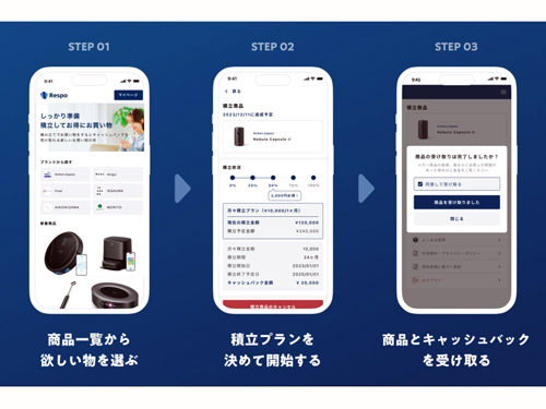 「Respo」は毎月一定金額を積立てることで、商品をお得に購入できるマーケットプレイスだ。24年1月にサービスの提供を本格開始した。ユーザーは購入したい商品を選択し、「月々いくら積立てるか」または「何カ月間積立てるか」を決める。積立てが完了すると商品が手元に届く仕組みだ。