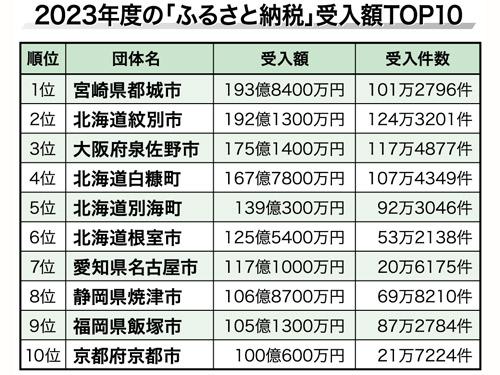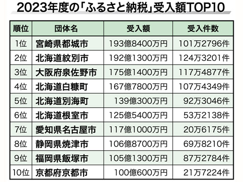 総務省は8月2日、23年度(令和5年度)のふるさと納税の現況調査の結果を公表した。23年度のふるさと納税の寄付受入件数は前年度比約1.1倍の5894万6000件となり、受入額は同約1.2倍の1兆1175億円となった。市町村別の受入額では、宮崎県都城市が2年連続で1位になった。