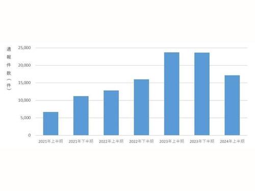 (一財)日本サイバー犯罪対策センター(JC3、事務局東京都)は9月12日、24年上半期(1~6月)の悪質なショッピングサイトなどに関する統計情報を発表した。悪質ショッピングサイトなどの通報件数は、1万7159件で、前年同期比、6515件の減少となった。