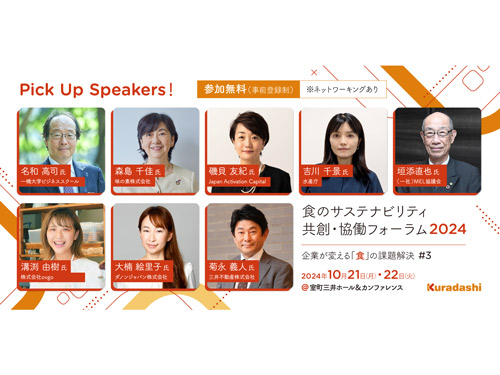 ソーシャルグッドマーケット「Kuradashi(クラダシ)」を運営するクラダシは10月21~22日、東京・中央区日本橋室町三丁目2番1号 COREDO室町テラス3階「室町三井ホール&カンファレンス」において、「食のサステナビリティ共創・協働」をテーマにしたフォーラムを開催する。