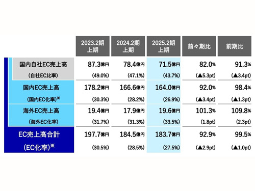 TSIホールディングスの24年3―8月期(中間期)における国内EC売上高は、前年同期比1.6%減の164億円だった。ブランド撤退により減収となったが、その影響を除くと前年並みの業績だったという。