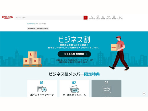 楽天グループ(楽天)は12月12日、ECモール「楽天市場」において、業務用品をリーズナブルに購入できる期間限定のワーカー向けメンバーシップサービス「ビジネス割」の提供を開始した。登録者限定で対象アイテムの購入に対してポイント5倍や500円引きのクーポンを提供する。まずは試験的にサービスを運用し、今後、本格的にBtoB―ECサービスの提供を検討する見通しだ。