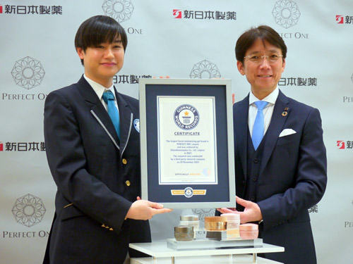 新日本製薬はこのほど、スキンケアブランド「パーフェクトワン」の主力商品「パーフェクトワン オールインワン美容液ジェルシリーズ」が2年連続でギネス世界記録を達成したと明らかにした。同社は1月24日、「ギネス認定証授与式」を東京・丸の内で開催した。