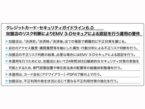 新ガイドラインには「加盟店がEMV3―Dセキュア以外に講じる不正利用対策の内容や抑止効果に応じて、カード番号の登録時にEMV3―Dセキュアによる認証を行う運用や加盟店のリスク判断によりEMV3―Dセキュアによる認証を行う運用も認められる」とも記載している。