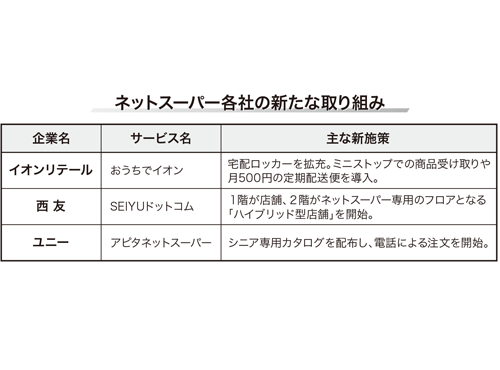 ネットスーパー各社が消費者の多様なニーズに応えることを目的にサービスを拡充させている。イオングループは、千葉の幕張新都心店において受け取りロッカーを拡充したり、注文から2時間以内に配送する新サービスや定期購入の仕組みを導入する。西友は6月に、店舗の2階をネットスーパーの専用フロアとした「ハイブリッド店舗」をオープンし、雨の日などの受注増に対応する。ユニーは、シニア向けの専用カタログを配布し、電話による受注を拡充させる。リードタイムの短縮や受け取り方法の多様化を進めることで、顧客のニーズを取り込んでいく考えだ。