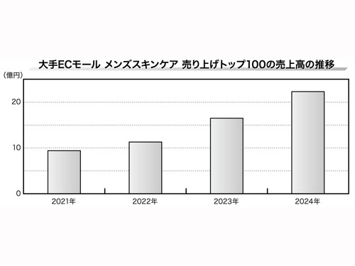 メンズコスメ市場が拡大している。「Nint ECommerce(ニントイーコマース)」のデータによると、大手ECモールでは21年から24年にかけて、メンズスキンケア市場が年々、拡大している(グラフ参照)。男性の美意識の変化を背景に、男性向けのスキンケアなどのコスメが続々と販売されている。男性は比較的、気に入った商品やブランドを長く愛用する傾向があるという。そんな男性の消費傾向を踏まえ、有力なメンズコスメブランドは効果的にリピーターの育成に成功している。