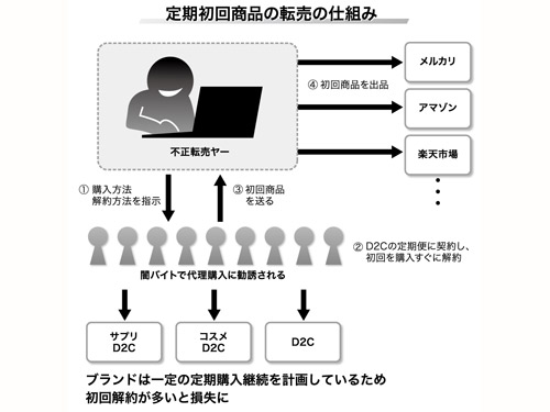 不正なアフィリエイターは、クラウドワークスなどを通じて主婦や学生に、健康食品や化粧品の代理購入を発注。代理購入者は、アフィリエイターのブログなどから販売サイトに遷移し、定期購入契約を行う。代理購入者は初回品をアフィリエイターに送った後、定期購入を解約。アフィリエイターは、定期初回商品をメルカリやアマゾンで転売し、アフィリエイト報酬と転売の利益を手にするという手口だった。