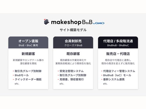 GMOメイクショップ(本社東京都、向畑憲良CEO)は9月12日、法人間取引(BtoB)に特化した新しいEC構築プラットフォーム「makeshop BtoB byGMO(makeshop BtoB)」の提供を開始した。「オープン直販」「会員制卸売」「代理店/多段階流通」といった多様なBtoBの事業モデルに対応し、事業規模に合わせた柔軟な拡張性で、BtoB―ECにおける企業のDX戦略を強力に支援する。