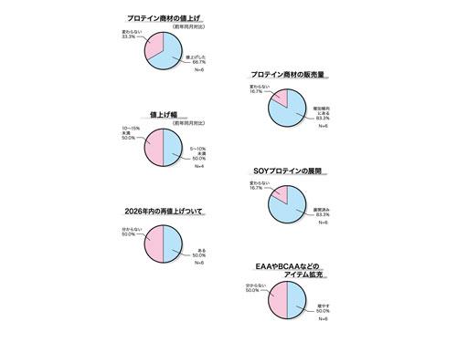 本紙はこのほど、プロテイン商材の販売動向に関するアンケート調査を行い、6社から回答を得た。主要な回答は別表の通り。
