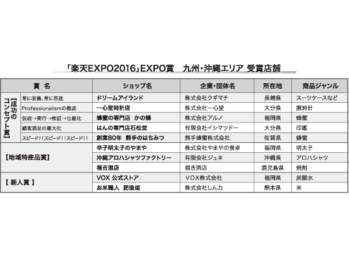 楽天は9月5日、福岡市内で出店者向けのビジネスイベント「楽天EXPO」を開催した。当日の朝に台風が直撃したにもかかわらず、約520人の出店者が参集した。長年にわたって「楽天市場」の事業に携わってきた高橋理人常務執行役員が担当事業を異動するため今回が最後のEXPOでの登壇となり、懇親会のあいさつでは盛大な拍手が送られた。懇親会の最中には九州・沖縄エリアから優秀な10店舗を表彰するEXPO賞の授賞式も開催。焼酎、蜂蜜、炭酸水、明太子など、商品を特化して専門的に販売している出店者の受賞が目立った。受賞店舗に店舗運営で工夫した点や今後の目標などについて聞いた。