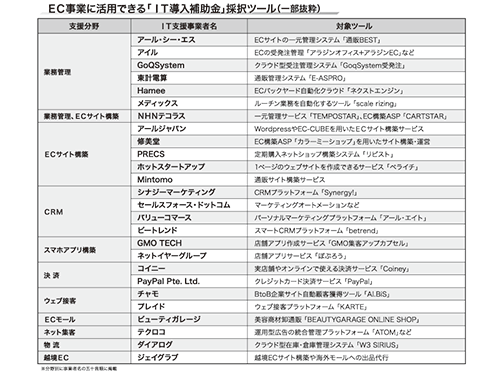 EC事業の運営において活用できる対象ツールは、ECサイト構築システムや受注管理システム、CRMシステム、ウェブ接客ツールなど幅広い(別表参照)。