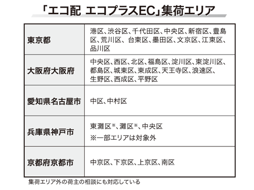 新サービスは大手配送事業者との提携によって実現した。集荷はエコ配が行い、宅配は提携事業者が行う。集荷エリアは東京、愛知、大阪、京都、兵庫の主要地域のみ(別表参照)。今後、集荷エリアを拡大する計画もある。