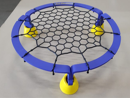 バスケットボールの練習用具「エアドリブル」は、「室内で使用可能なバスケットボールの練習用具が欲しい」と会社経営の知人から相談を受け、共同開発を始めた。空まめシステムの取引先である韓国メーカーが製造している。近年、公園でのボール遊びが禁止されるケースが多く、商品化した。