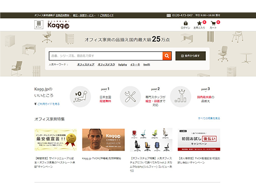 オフィス家具のECサイトを運営する47インキュベーション(本社沖縄県、宇垣充浩社長)は4月7日、ECサイト「Kagg.jp(カグドットジェイピー)」を全面刷新した。法人向けに後払い決済の提供を開始し、メーカー名やブランド名での商品検索機能などを強化した。今年3月の月商は前年同月比で230%増となっており、利便性を高めてさらなる売り上げ拡大を図る。