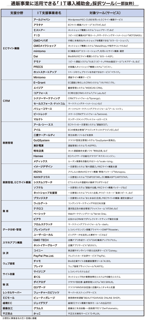 2次公募開始に合わせ、さらに多くのツールが対象となった。2000社以上が提供する8000以上のサービスが対象となっている。EC事業に直接的に活用できるツールだけでも57はある(別表参照)。