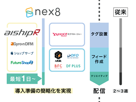連携により「アイシップアール」を利用する企業は、管理画面から簡単に「nex8」のタグの設置ができ、精度の高いリターゲティング配信が可能となる。=図参照