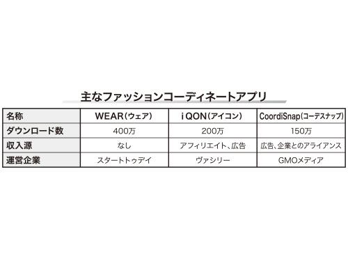 コーディネートアプリは、写真の投稿やコメントを通じてユーザー同士が交流するプラットフォーム。国内ではスタートトゥデイの「ウェア」、ヴァシリーの「アイコン」、GMOメディアの「コーデスナップ」などが先行している。