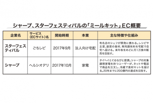 食材がカットされた状態で届く「ミールキット」の市場が注目されている。法人向けに弁当などの宅配を展開するスターフェスティバル(本社東京都、岸田祐介社長)は9月27日に「ごちレピ」を開始。シャープも10月に、タイヘイやぐるなびと組んで「ヘルシオデリ」を始めた。11月には、セブン&アイ・ホールディングスが生鮮食品のEC事業「IYフレッシュ」開始し、ミールキットの販売に乗り出している。ヨシケイやタイヘイといった食材宅配の老舗企業も「夕食食材キット」を「ミールキット」としてブランドを再構築している。競合ひしめくこの市場に参入したシャープとスターフェスティバルは単なるEC展開とは異なる狙いもあるようだ。