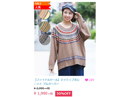 昨年12月中旬から商品画像の下に、お気に入り登録数を示すハートマークを表示している。同時に、商品価格を税別表記に変更。1月1~23日までのコンバージョン率は17年11月同期間比で84.1%改善した。
