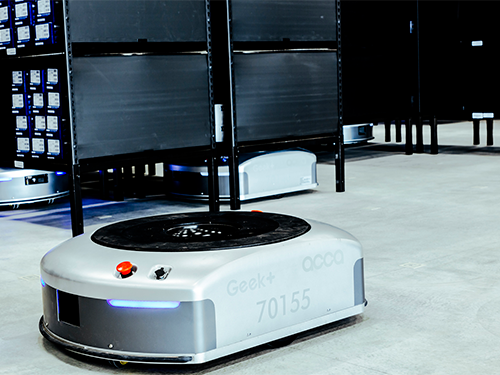 ロボットの導入台数は累計約1500台。アッカ・インターナショナルの倉庫では、17年7月よりギークプラスのロボットとシステムが稼働している。ピッキング支援ロボット「EVE(イブ)500」を30台導入。保管棚を搬送するロボットで、ピッカーが倉庫内を歩いて商品をピッキングする手間を省く。