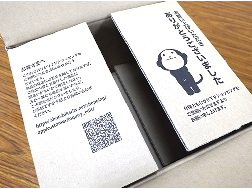 配送商品を梱包する段ボールを開けると、QRコードが目に入る。段ボールの製作を委託する際、QRコードのほか自社のイメージキャラクターも印字している。
