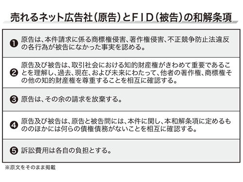 和解条項には「原告(売れるネット広告社)は、本件請求に係る商標権侵害、著作権侵害、不正競争防止法違反の各行為が被告(FID)になかった事実を認める」などと記載されている(表参照)。