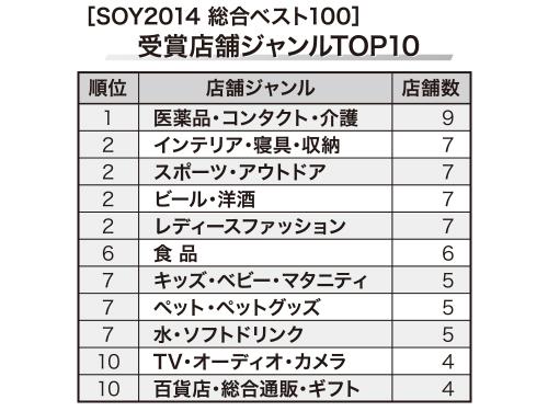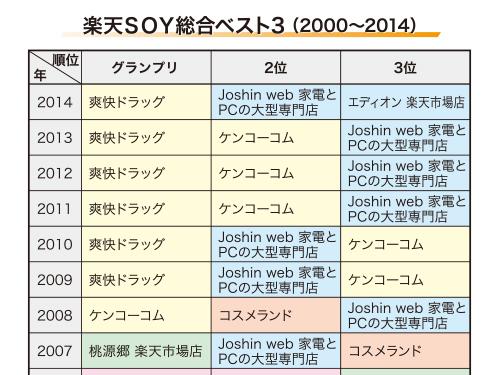 楽天は1月13日、楽天市場の優れた店舗を表彰する「ショップ・オブ・ザ・イヤー(SOY)2014」の受賞店舗を発表した(4~15面に関連記事)。これまでのSOY総合ベスト3を見ると、07年以前は販売手法に趣向を凝らした「ファッション系」「趣味系」の店舗がランクインしていた。ただ、09年以降は品ぞろえや価格競争力に優れた「日用品系」「家電系」の店舗がベスト3を占めており、上位店舗の大型化が進んでいることが分かった。