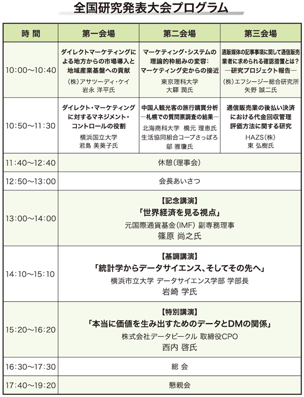 日本ダイレクトマーケティング学会(JASDM、事務局東京都、中島純一会長)は6月30日、横浜市の慶應義塾大学矢上キャンパスで、第17回全国研究発表大会を開催する。テーマは「AI時代の人とデータの協業〜データ解析が切り開く未来〜」。記念講演には元国際通貨基金(IMF)副専務理事の篠原尚之氏を招き、世界経済に起きているメガトレンドを分析する。
