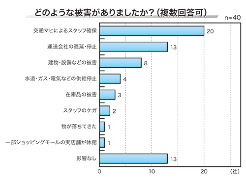 被害状況で最も回答率が高かったのが、「交通マヒによるスタッフ確保」で、20社が回答した。回答企業からは、「楽天スーパーセール期間中の休日明けで注文と問い合わせが殺到する中、電車通勤による受注系業務のスタッフが出勤できず、対応が後手に回った」という声も上がった。