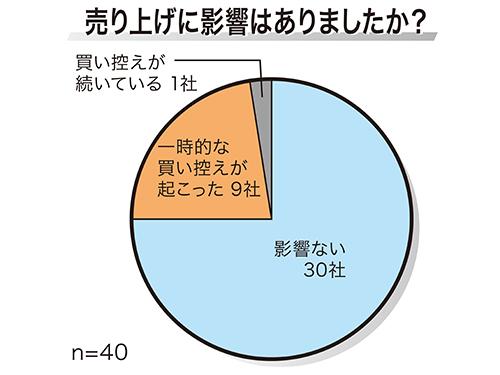 売り上げに対する影響については、9社が「一時的な買い控えが起こった」、1社が「買い控えが続いている」と回答した。一部企業において地震が経営に少なからず影響を与えていることが分かった。