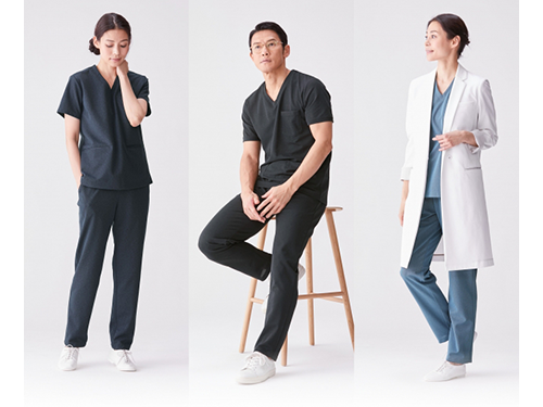 新素材「リネンライク」は、メディカルウエアとして洗濯への耐久性や色落ち防止の機能性を兼ね備えながら、リネンのような質感と色合いを実現した。サラサラとした着心地で、汗を素早く吸い上げ、洗濯後もすぐに乾く夏の医療現場に適している。