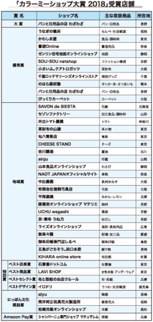 日本文化奨励賞ではマガジンハウスが運営するウェブマガジン「コロカル」編集部と審査し、3店舗を表彰。AmazonPay(アマゾンペイ)賞はアマゾンジャパンと審査し、1店舗を表彰した。