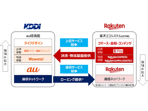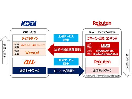 楽天は11月1日、KDDIと決済、物流、通信ネットワーク分野において協業すると発表した。楽天は携帯キャリア事業において、KDDIの通信ネットワークを活用する。KDDIグループのECモール「Wowma!(ワウマ)」では、楽天の物流サービスを活用するという。