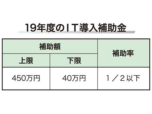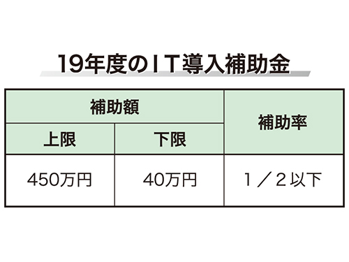 19年度の補助額は、上限が450万円、下限額が40万円になる。ITツール導入費用の2分の1までが補助の対象となる。18年度の補助額は、上限が50万円、下限が15万円だった。