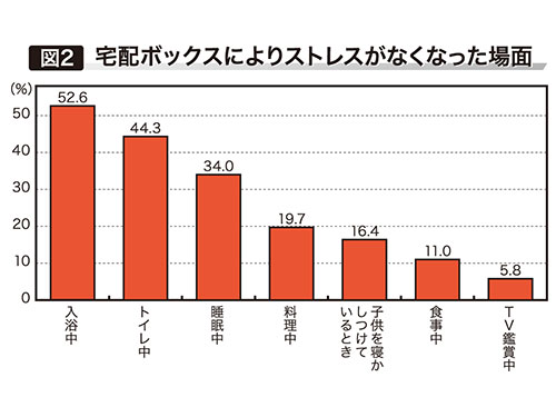 ストレスが軽減した場面としては「入浴中」や「トイレ中」が上位を占めた(図2参照)。被験者からは「ちょっとした外出の際や、入浴、就寝中も安心できた」(30代女性会社員)といった意見が上がった。配達を待つ在宅中の行動が制限されているケースも多いようだ。