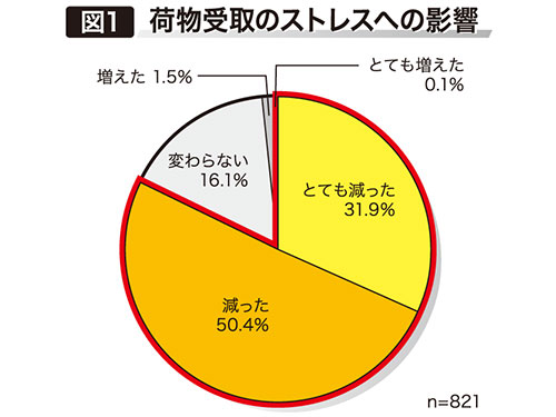 実験後のアンケートでは、82.3%の被験者が、荷物の受け取りによるストレスが軽減したと回答(図1参照)。荷物の受け取り頻度として「ほぼ毎日」と回答した被験者では、82.3%がストレスの軽減を実感したとしている。