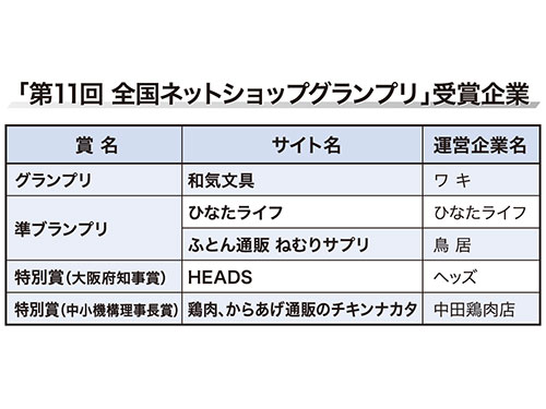 「全国ネットショップグランプリ」には約200社から応募があったという。パソコンサイトとスマホサイトの両方について、アイデアのユニークさ、目新しさ、情報提供の適切さ、デザイン性の高さや操作性などを評価している。グランプリ以外に準グランプリを2社、特別賞として「大阪府知事賞」「中小機構理事長賞」を選出した(表参照)。